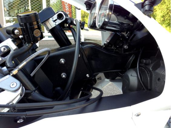 On peut voir les platines de commande reculées taillées dans la masse. La selle de Daytona 675 a été modifiée et élargie de 8 cm avec un faux réservoir pour abaisser un maximum le centre de gravité afin de mieux incruster le pilote dans la machine.